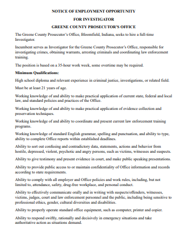 /The Greene County Prosecutor’s Office in Bloomfield is accepting applications for a full-time Investigator position. The investigator is responsible for conducting criminal investigations, obtaining warrants, making arrests, and coordinating law enforcement training on behalf of the office. Applications will be accepted through Jan. 16.