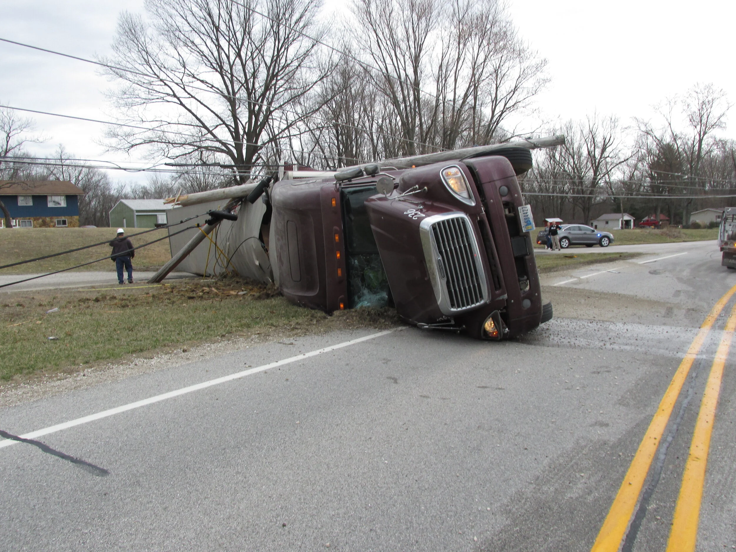 Deputy Carpenter, the investigating officer, said the semi was westbound on SR 54 headed to Metal Technologies in Bloomfield. The driver said he was going approximately 50 mph when he felt the truck shake. The driver said it had been windy all day and he thought it was just the wind again. But as he was going through the curve at SR 54 and Sharkey Road, the vehicle started to roll over onto its passenger side.