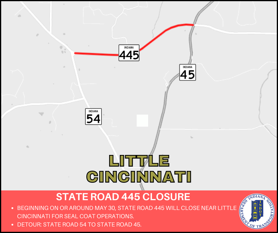 Beginning on or around May 30, crews will close State Road 445 for seal coating operations near Little Cincinnati. Seal coating operations will occur between State Road 54 and State Road 45. Work is expected to last through June 9, depending on the weather. The detour for this project is State Road 54 to State Road 45.
