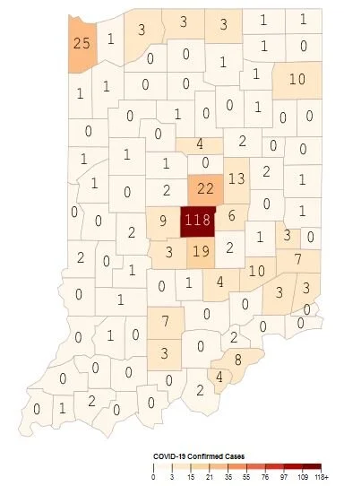 Cases are listed by county of residence. Private lab reporting may be delayed and will be reflected in the map and count when results are received at ISDH. Beginning Monday, April 13, the dashboard will be updated at noon each day.
