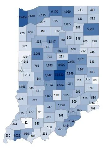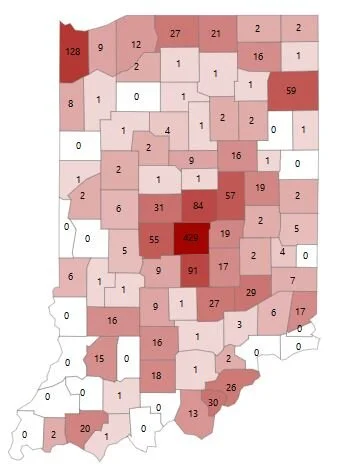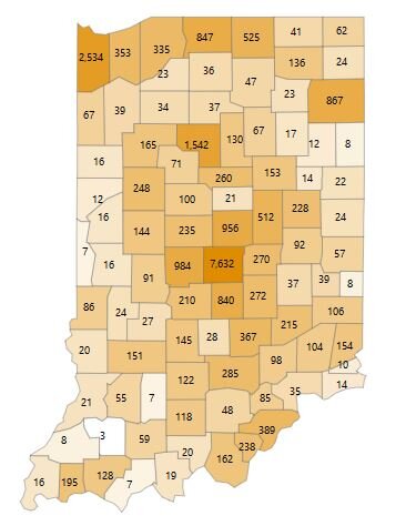 Marion County had the most new cases, at 136. Other counties with more than 10 new cases were Allen (35), Bartholomew (12), Cass (20), Dubois (13), Elkhart (32), Hamilton (23), Hendricks (12), Johnson (17), Lake (50), Porter (25), St. Joseph (17), Tippecanoe (10) and White (14). The Lake County totals include results from East Chicago and Gary, which have their own health departments. A complete list of cases by county is posted at www.coronavirus.in.gov, which is updated daily at noon. Cases are listed by county of residence.