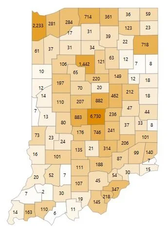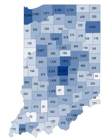 Marion County had the most new cases, at 315. Other counties with more than 10 new cases were Allen (23), Bartholomew (16), Cass (38), Elkhart (20), Hamilton (27), Hendricks (99), Johnson (16), Lake (72), LaPorte (17), Madison (10), Porter (10), Shelby (12), St. Joseph (28) and Vanderburgh (10). The Lake County totals include results from East Chicago and Gary, which have their own health departments.