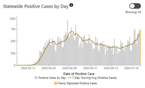 Graph of statewide cases by day shows the uptick