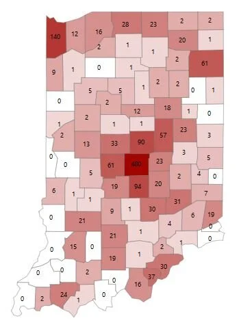 Marion County had the most new cases, at 107. Other counties with more than 10 new cases were Allen (38), Bartholomew (12), Clark (18), Delaware (20), Dubois (46), Elkhart (19), Hamilton (14), Howard (10), Johnson (10), Lake (43), Porter (11), Shelby (10), St. Joseph (14) and Vanderburgh (13). A complete list of cases by county is posted at www.coronavirus.in.gov, which is updated daily at noon. Cases are listed by county of residence.