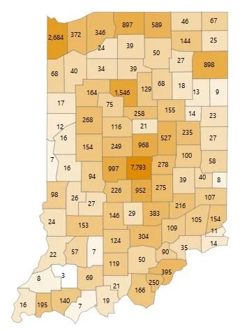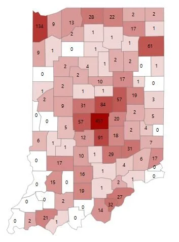 Johnson County had the most new cases, at 116. Other counties with more than 10 new cases were Allen (27), Bartholomew (12), Boone (14), Elkhart (48), Hamilton (10), Lake (98), Marion (103), Porter (11), St. Joseph (42) and Vigo (12). The Lake County totals include results from East Chicago and Gary, which have their own health departments. A complete list of cases by county is posted at www.coronavirus.in.gov, which is updated daily at noon. Cases are listed by county of residence.