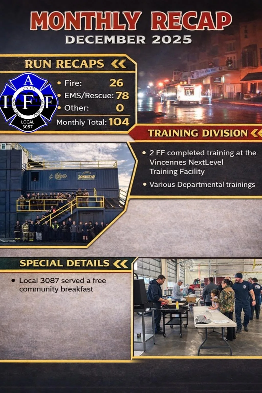 Entries on the Monthly Recap at the Linton Fire Department during the month of December 2025 included response to 104 calls, including: